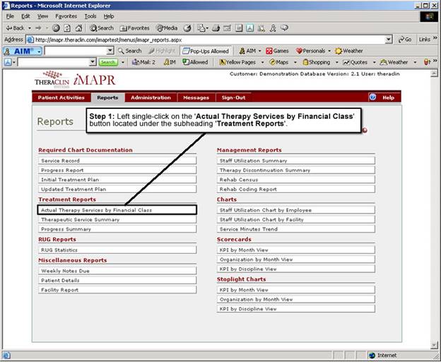 1. Left single-click on the ‘Actual Therapy Services by Financial Class' button.