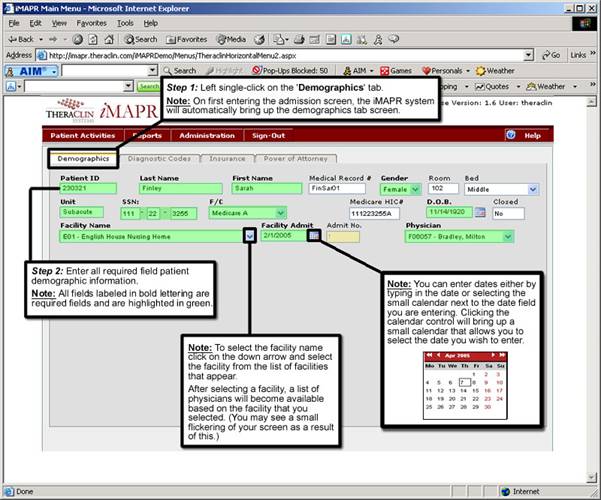1. Left single-click on the ‘Demographic’ tab located at the top of the admission screen.