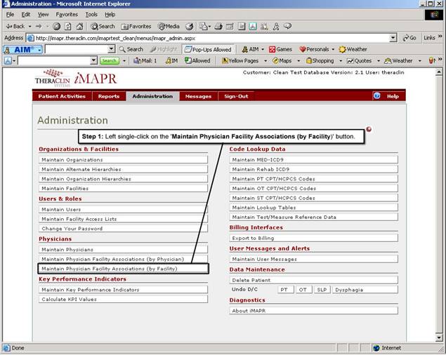 1. Left single-click on the ‘Maintain Physician Facility Associations (by Facility)’ button.