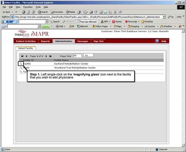 1. Left single-click on the ‘magnifying glass' icon next to the facility that you wish to add physicians.