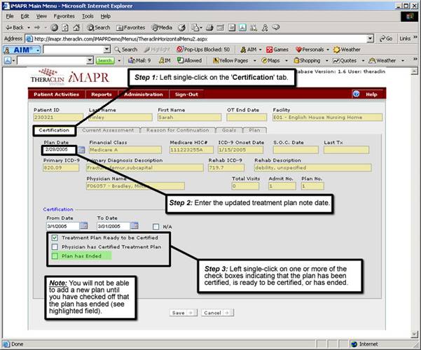 3. Left single-click on one or more of the check boxes indicating whether the current status of the current treatment plan has been certified by the physician, is read to be certified by the physician, or/and the treatment plan has ended.