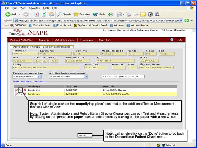 System Administrator and Rehabilitation Director Clearances can edit Test and Measurements by clicking on the ‘pencil and paper’ icon or delete them by clicking on the ‘paper with a red X’ icon. Left single-click on the ‘Done’ button to go back to the ‘Discontinued Patient Chart’ menu.