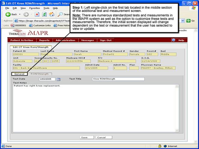 There are numerous standardized tests and measurements in the iMAPR system as well as the option to customize these tests and measurements. Therefore, the initial screen displayed will change dependent on the test or measurement that the user has selected to view or update.