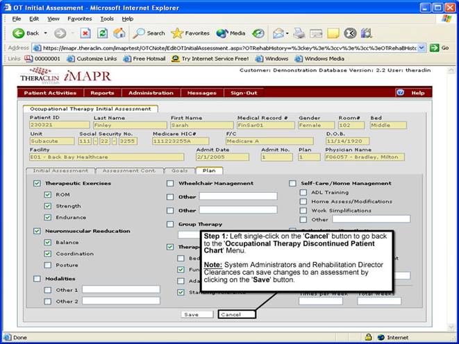 1. Left single-click on the ‘Cancel' button to go back to the ‘Occupational Therapy Discontinued Patient Chart’ menu.