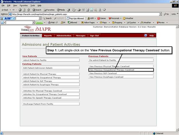 1. Left single-click on the ‘View Previous Occupational Therapy Caseload' button located on the Patient Activities menu. This allows therapists to view all the prior plan occupational therapy processes for a specific patient from one local menu.