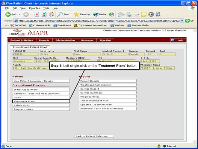 1. Left single-click on the ‘Treatment Plans’ button located on the ‘Occupational Therapy Discontinued Patient Chart’ menu.
