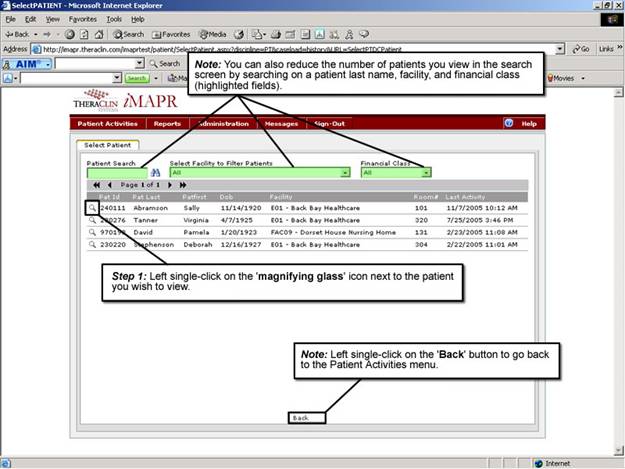 You can reduce the number of patients you view in the search screen by searching on a patient’s last name, facility, and financial class. To return to the ‘Patient Activities’ menu, left single-click on the ‘Back’ button.