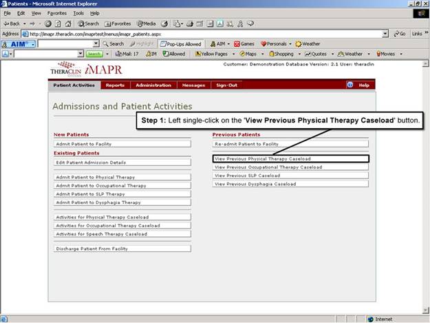 1. Left single-click on the ‘View Previous Physical Therapy Caseload' button located on the Patient Activities menu. This allows therapists to view all the prior plan physical therapy processes for a specific patient from one local menu.