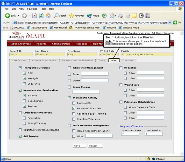 This screen allows you view the treatment plan established for the patient.