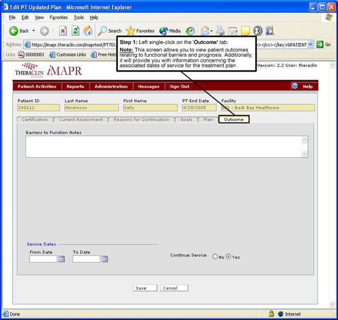 This screen allows you to view patient outcomes relating to functional barriers and prognosis. Additionally, it will provide you with information concerning the associated dates of service for the treatment plan.