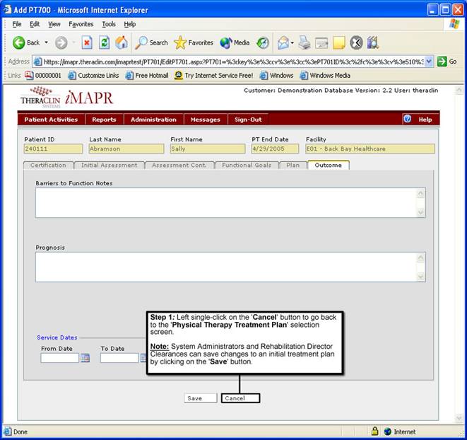 1. Left single-click on the ‘Cancel’ button to go back to the ‘Physical Therapy Treatment Plan’ selection screen.