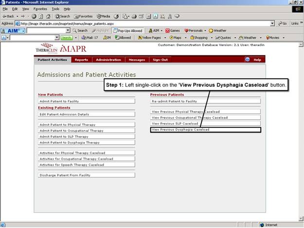 1. Left single-click on the ‘View Previous Dysphagia Caseload' button located on the Patient Activities menu. This allows therapists to view all the prior plan occupational therapy processes for a specific patient from one local menu.
