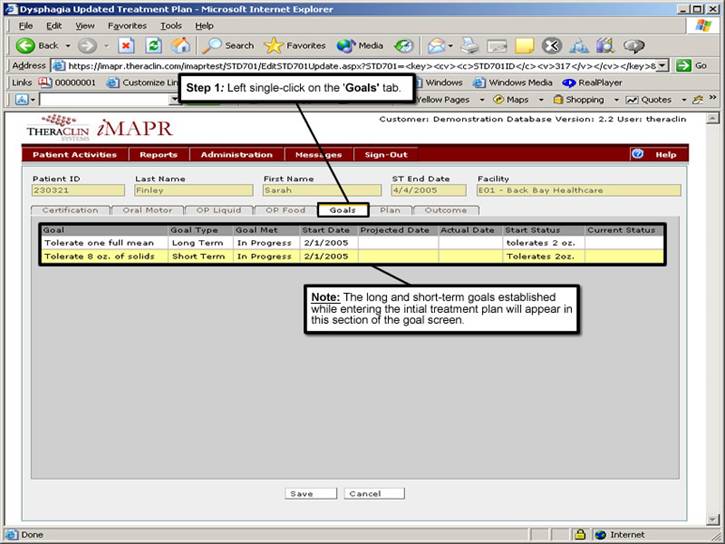 The long and short-term goals established while entering the initial assessment will appear on the lower-half section of the goal screen.