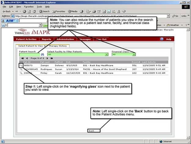 You can reduce the number of patients you view in the search screen by searching on a patient’s last name, facility, and financial class. To return to the ‘Patient Activities’ menu, left single-click on the ‘Back’ button.