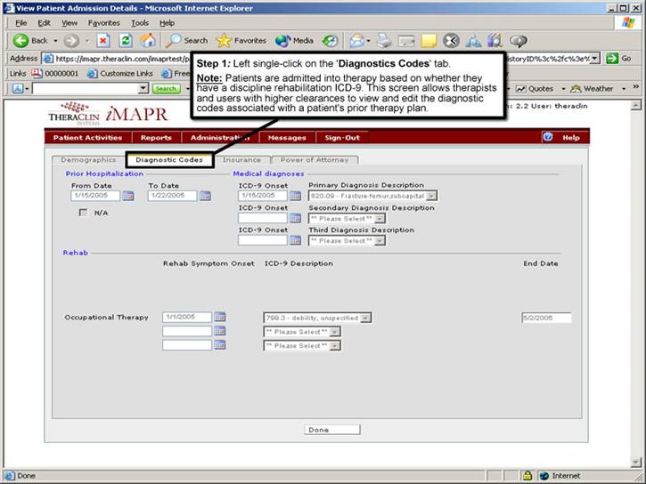 Patients are admitted into therapy based on whether they have a discipline rehabilitation ICD-9. This screen allows therapists and users with higher clearance to view and edit the diagnostic codes associated with a patient’s prior plan.