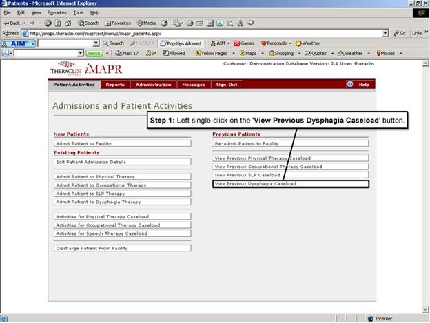 1. Left single-click on the ‘View Previous Dysphagia Caseload' button located on the Patient Activities menu. This allows therapists to view all the prior plan Speech therapy – Dysphagia processes for a specific patient from one local menu.