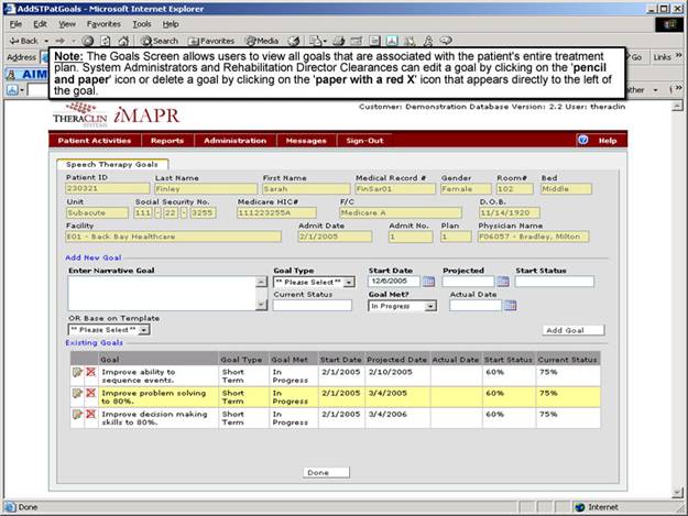 The Goals Screen allows users to view all goals that are associated with the patient’s entire treatment plan. System Administrator and Rehabilitation Director Clearances can edit a goal by clicking on the ‘pencil and paper’ icon or delete a goal by clicking on the ‘paper with the red X’ icon that appears directly to the left of the goal.