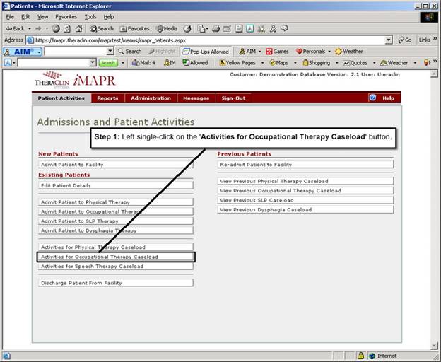 1. Left single-click on the 'Activities for Occupational Therapy Caseload' button located on the right-hand side of the Patient Activities menu.