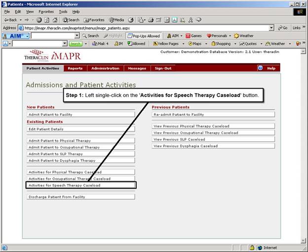 1. Left single-click on the 'Activities for Speech Therapy Caseload' button located on the right-hand side of the Patient Activities menu.